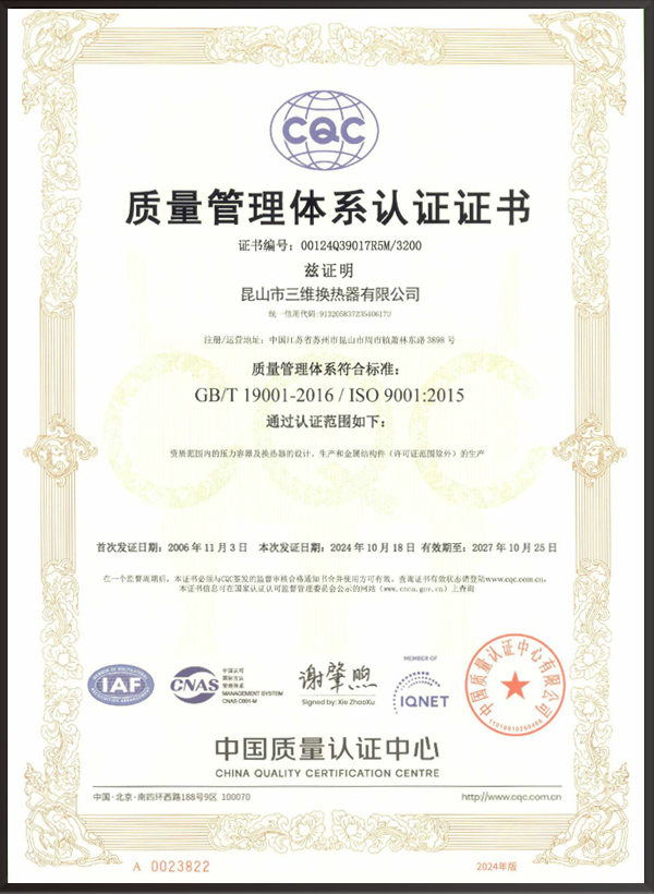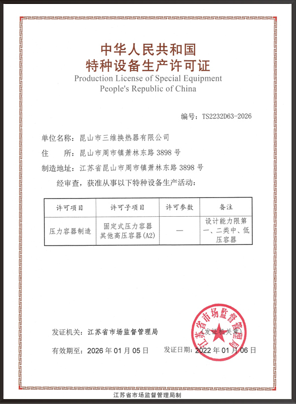 昆山市三維換熱器有限公司注冊資本5000萬元,資產2.1億元,公司地址位于江蘇省昆山市周市鎮蕭林東路3898號,法人代表為顧安生,公司設有技術部、生產部、檢驗部。